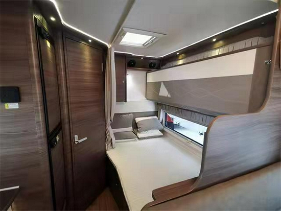 车尾纵置子母床是车友好评、喜欢的布局之一,这款车的后床区域采用软包处理,床位尺寸大小与同级车型大小类似,下铺是双人床,顶铺是一张单人床。共有4张床铺,可供4-6人同时睡觉休息,在一款无拓展的房车内,能同时容纳这么多人休息的房车,也就这台CD500可以做到如此优秀。