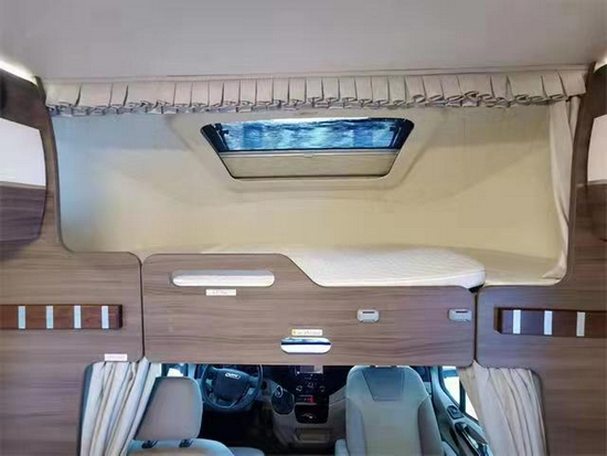 整体内饰设计简洁大方,内墙体采用进口E0级环保轻质板材,中国风内饰木纹色肌理饰板,工艺精湛美观,软包部分均采用商务车级别真皮包覆,搭配暖黄色灯光呈现如家一般的温馨氛围。驾驶室上方额头床尺寸为2.1*1.2的双人床,空高65公分,配备床头阅读灯,USB接口,额头床上方设有一个超大的曲面天窗,使额头床区域的采光、通风性能得到了很好的提升,额头床采用分段式设计,为车内休息区域提供一台推拉式的32寸液晶电视机。