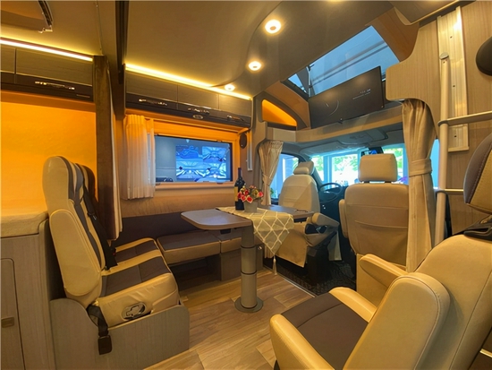 客厅座椅,采用L型沙发与单人卡座座椅搭配,另外副驾驶座椅也可以进行旋转与后方的客厅进行互动。不过此款房车L型卡座沙方的横侧方,与传统的还是有区别的,这里采用与副驾驶座椅相同的形式,更加符合人体曲线,既能提供很好的舒适性也能提供一定的安全性。 卡座中间是多级多向可调节进口升降餐桌,此种餐桌可以满足无论个人在哪一边就坐都可以转向给乘客提供方便,在晚上休息时下调后可以与卡座沙发对接形成舒适的沙发床。