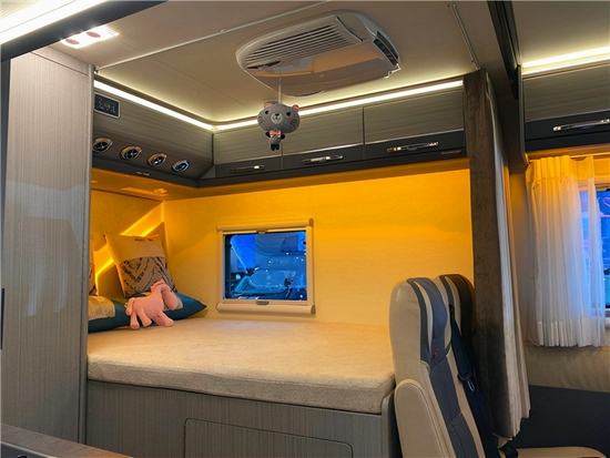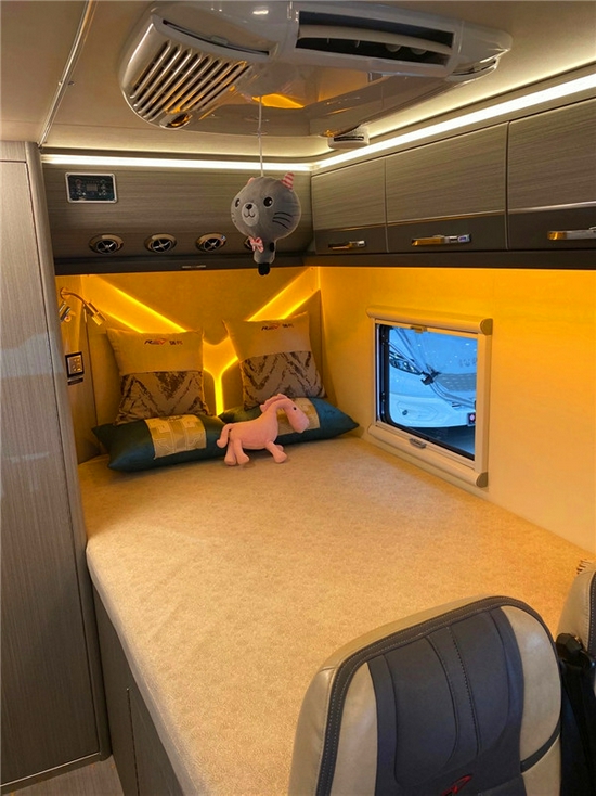 坐进车内。驾驶室部分,地板和座椅进行了重新包覆,豪华感更强。倒车影像,智能车机和定速巡航,多功能方向盘等配置都没有缺席。即使是一辆T型房车,但合理布局体现在每一个格调配置上。合理的设计让车辆拥有了更多的可支配空间。隐藏式吸顶升降床,更实用,省空间。同时,带来了优秀的采光表现,这让行车时的压抑感大大减少。天窗处搭配了LG的29寸超宽屏幕,用于娱乐和影音。