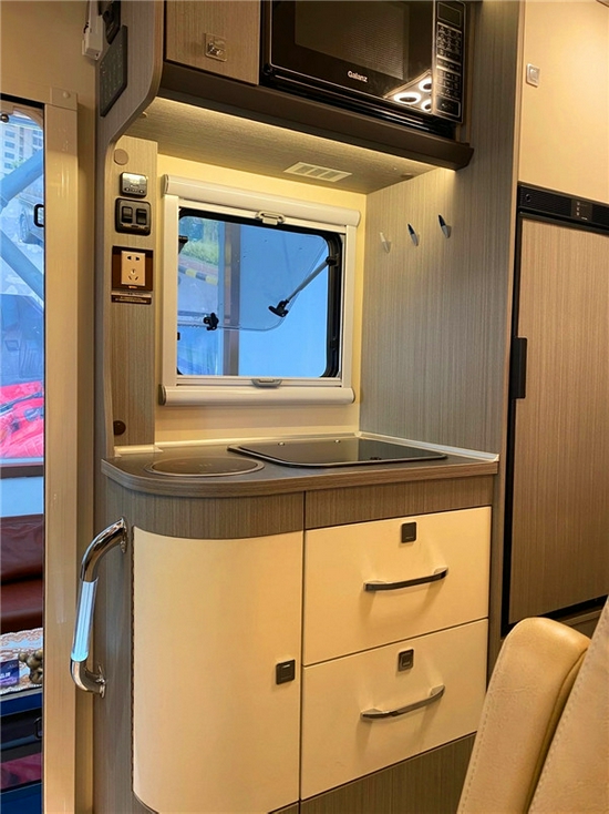 厨房区域在中门后侧,过道也不算很窄所以空间感还是不错的。配备了一个带盖的水槽和一个电磁炉,能够满足一般的烹饪需求。下侧是多个抽拉柜,能够存放所有的厨房用品和餐具,右侧是90L的一个大容量的冰箱,能够存放不少的食材。上侧是微波炉,使用起来也很便利。