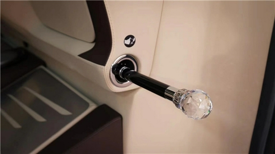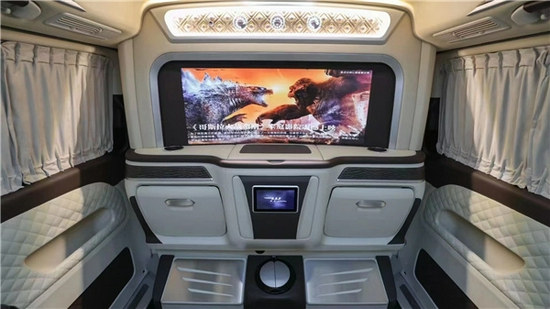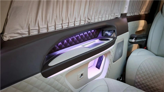 前后舱采用全隔断设计,大屏升降电视驾驶舱与乘客舱均可控制升降,为重要商务洽谈提供完美私密空间。屏幕上方是一个经典航空钟表,造型新颖别致,下方是一个空气净化器的配置,为封闭车内空间提供新鲜空气,完美保障车内空气流通。第三排座椅是很人性化的中排座椅可以向后旋转,因为后舱的空间完全足够,这样的话和三排可以对坐交谈了