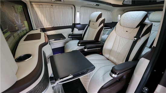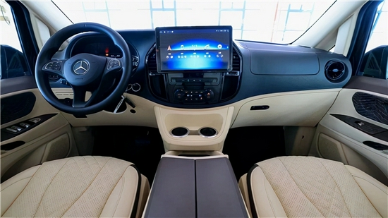 内饰够豪才是真的豪华。全新奔驰威霆7座商务车一袭宾利黄真皮包覆驾驶舱,正副驾驶座椅打孔真皮包覆,中控台升级超大的液晶显示屏,加上多功能方向盘等,整体的质感档次完全提了上来。
