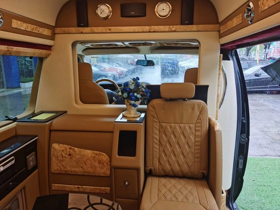 福特E350房车是大型的商务车,它与GMC房车很像,都是霸气的外观及豪华的内饰而闻名,福特E350可以改装航空座椅及隔断、吧台、升降电视、豪华顶灯灯各种项目。一般原车为改装好内饰的整车出售,但是也有很多人用了几年后重新翻新内饰改装的,本工厂可以根据客户需求改改装福特E350的内饰,进行个性化私人定制内饰方案。