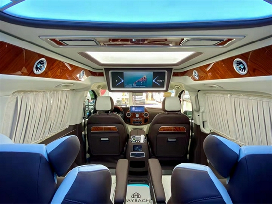顶部28寸小隔断电视,下方小吧台带触控屏灯光的一键控制,非常便捷,独立的办公桌板更好的为您提供办公用途,米色的超纤真皮与橡木的点缀,无时无刻都在彰显他的豪华非凡,车顶覆盖天使之翼光纤顶灯和意大利进口Alcantara麂皮,整车覆盖超纤皮革。整车配备防震棉和隔音棉。