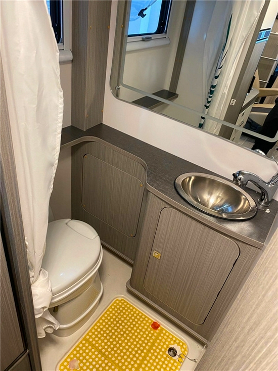 厨房区域在中门后侧,过道也不算很窄所以空间感还是不错的。配备了一个带盖的水槽和一个电磁炉,能够满足一般的烹饪需求。下侧是多个抽拉柜,能够存放所有的厨房用品和餐具,右侧是90L的一个大容量的冰箱,能够存放不少的食材。上侧是微波炉,使用起来也很便利。