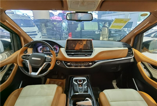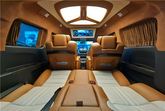 时尚内饰装饰,隐私布艺窗帘,高级皮革+麂皮绒包覆车壁,奢华的LED天幕顶灯。支持私人定制和选配升级改装,现车在店看好可提!