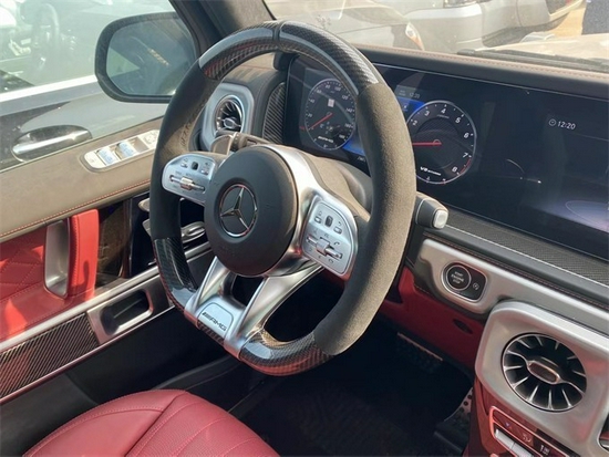 21款奔驰G63内饰方面,奔驰的设计绝对可以用惊艳来形容,无论是经典车型还是超豪华车型甚至是入门级的豪华车上,奔驰的内饰都会让你眼前一亮,当然了这也是奔驰的一个特色。所以这部全新的G63在内饰的表现上也是情理之中的,但是细节上还是有些小小的意外。这种感觉是打开车门的瞬间就能够感受到的。首先仪表和中控屏依旧是采用了同一款液晶屏显示,第一感觉就是科技感爆表。而其他方面例如方向盘,空调出风口,挡杆等等的设计充满设计感。