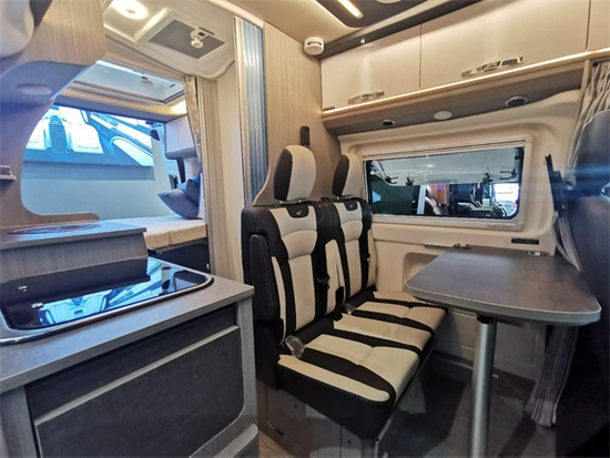 整车驾驶舱的主副座椅均进行了一个包袱,m1类强度双人可调节,而且副驾驶座椅有旋转功能。全车在顶部上面共设计有三个天窗,所以整车的通光性和透风性都是做的非常好。