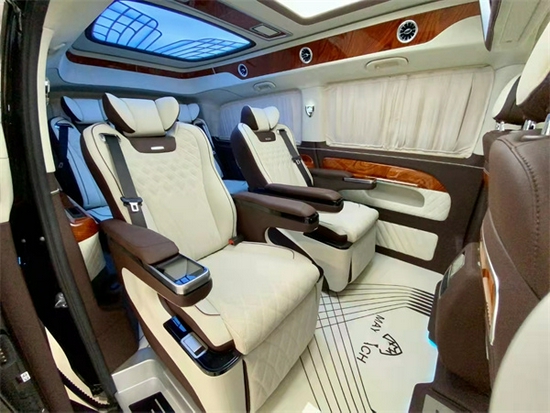 顶部28寸小隔断电视,下方小吧台带触控屏灯光的一键控制,非常便捷,独立的办公桌板更好的为您提供办公用途,米色的超纤真皮与橡木的点缀,无时无刻都在彰显他的豪华非凡,车顶覆盖天使之翼光纤顶灯和意大利进口Alcantara麂皮,整车覆盖超纤皮革。整车配备防震棉和隔音棉。