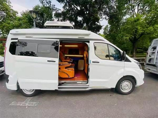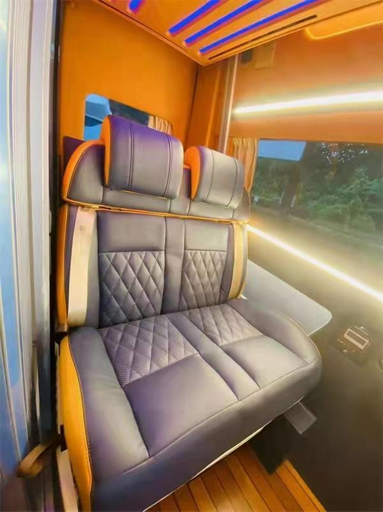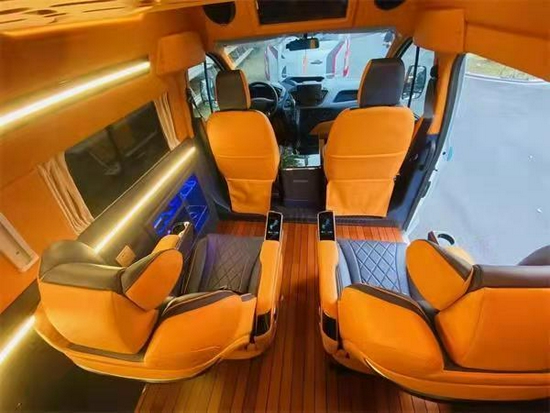 整车内部采用真皮包覆,驾驶室中央扶手设有40L的车载冰箱方便我们存放饮料,半隔断电视搭配环车音响让我们有优质的视听感受,地板为游艇级柚木地板,侧墙的氛围灯光与凹嵌式的储物格增添整车的格调,航空座椅具有通风、加热、按摩、电动腿托,头枕等功能,为我们提供舒适的乘坐感受。