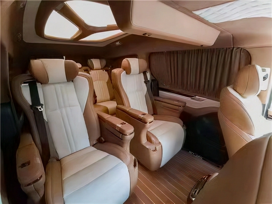 乘客舱的设计风格与驾驶舱大体一致,采用黄色以及白色的超纤真皮包覆,观赏性以及舒适性极高,地板采用的是柚木地板,加高的车顶设计既使我们在车内也不会有压抑感,内部空间进一步提升,其内部空间在同级别中绝对是首屈一指的。顶部采用星盾式天幕顶灯,以及周边采用大面积真皮包覆,让人有一种置身在豪华套房的舒适体验感。