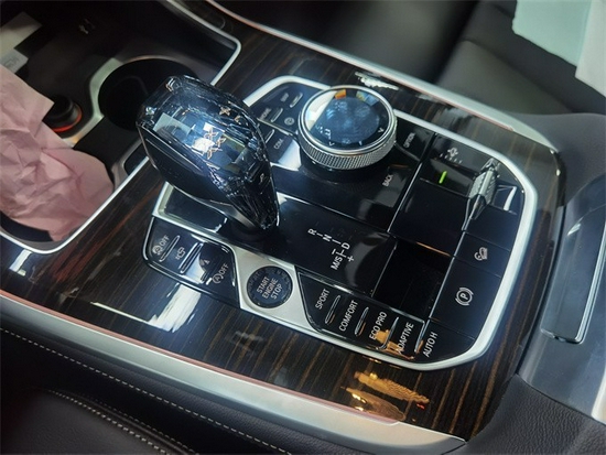 21款宝马X7采用宝马家族式设计,三幅式多功能方向盘的设计格外时尚,融入镀铬材质的点缀,质感提升不少。全液晶仪表盘配上悬浮式大尺寸多媒体液晶屏的设计,将给内饰带来不少的科技感。水晶挡杆的设计格外奢华,但是把P挡放置在挡杆后方不知道是否方便操作。