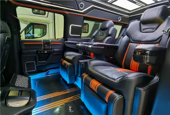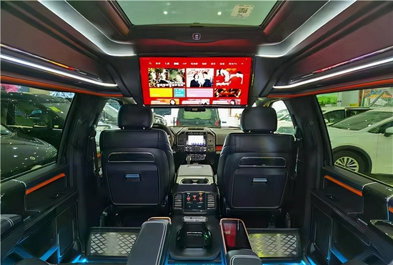 二排设置了两张带独立腿托的CEO级航空电动按摩座椅,下铺进口柚木地板,福特勇猛者独创半隔断式布局,使整车空间使用率达到最大化,还增加了升降电视机多功能吧台等设计。总体空间感十分宽敞,适用于商务接待或家族旅行。不仅座椅有良好的舒适体验感,而且整体的空间感对比市面上一些竞品SUV优势还是很明显的。顶部半隔断的车载无线网络电视机,以及下方吧台,为我们提供日常休闲娱乐的器械配置,再配合顶部天窗和后部的三色宫格顶灯相结合,搭配整车的线条式氛围灯,凸显整车的层次感,也烘托了整体的氛围。