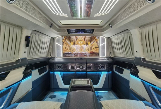 银河版贵宾舱则用采用豪华皮革、麂皮绒包覆,前后舱采用电视+吧台的实用隔断,哈曼卡顿殿堂级音响环绕系统+32寸高清升降电视的经典车娱组合,给您舒适与娱乐相结合的享受。