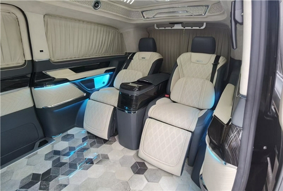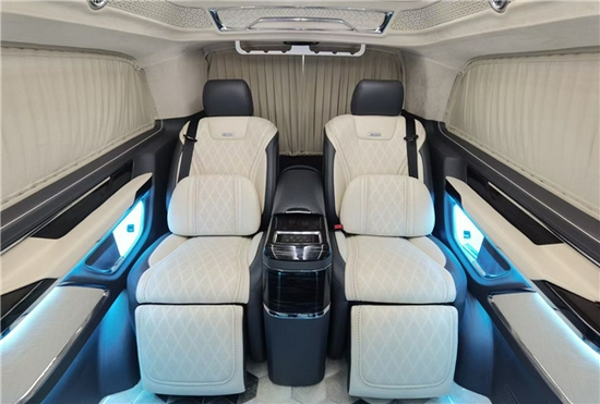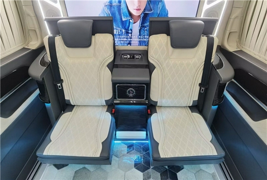 这款奔驰V260的贵宾舱采用的是两两对坐的商务洽谈格局设计,在大尺寸的液晶电视下方,奔驰V260配置了两个可折叠的秘书座椅,可一键电动展开。在两张秘书座椅的中间,是一个小型车内吧台,内置胶囊式咖啡机和一个折叠小桌台,最大限度的利用车内空间,折叠小桌台也可以给车内的商务人士提供一个处理文件以及与客户洽谈的台。
