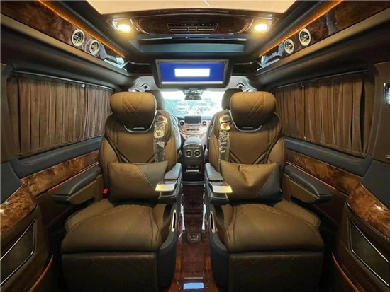 进入到了后排,才是这款车真正到达顶峰之作。首先整个座椅全部采用了零重力的商务座椅,面料上则是意大利头层的nappa牛皮包裹,并搭配菱形缝线打孔设计,棚顶采用了全组的方形光源,已经远超于常规MPV的配备。就连地板也采用了专属的配置,基本上每个设计都能展现出这款车的奢华感!