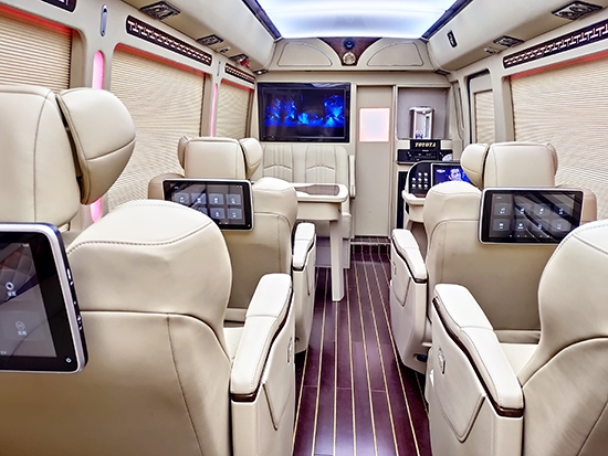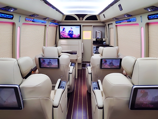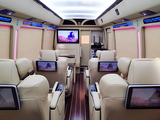 从内饰的改装上来说,这就有很多细节的设置了。从灯光的设置上就有很多种方式,我们可以在车顶内加装豪华的彩色灯,可以有橙色蓝色紫色等不同的灯光选择,营造车内氛围。窗帘内侧可以加装LED蓝色灯光,车内立柱加装LED灯光,台阶上也可以镶嵌LED灯光,显示品牌坐标等。同时还可以在通道来两侧增加LED蓝色灯光。我们都知道,光是最能衬托氛围的选择,对车内灯光的改装可以带给我们独特的视觉感觉,营造出或温馨或者淡雅的乘车环境。