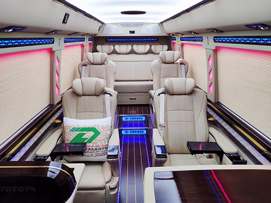 改装是为了更加美观更加舒适或者更能彰显一种尊贵的身份。丰田考斯特在内饰的改装上更加注重尊贵的衬托,高档的豪华座椅暂且不说,自动调节的百叶窗帘也无需再提,就拿车载的影音系统来说,我们完全可以依靠自己的需要设计符合我们需要的车载影音系统,高清的显示屏,专用的麦克以及高级的扬声器设备,随时随地带给乘车人员一种舒适的享受。