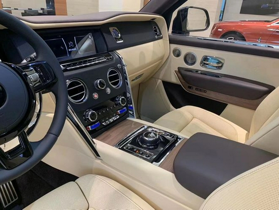 内饰遵循了劳斯莱斯一贯的设计风格,造型经典复古但不失科技感,大量实木饰板的采用,提升了内饰的档次感。而大面积真皮包裹的设计,则成功的营造出奢华舒适的内饰氛围。仪表盘的设计较为古朴,内部指针清晰可见,外圈还配备有劳斯莱斯珠宝般的装饰环。方向盘沿用了经典的三辐式造型,但是整体设计更加小巧、厚实,并且内部包裹有可加热的柔软材质。