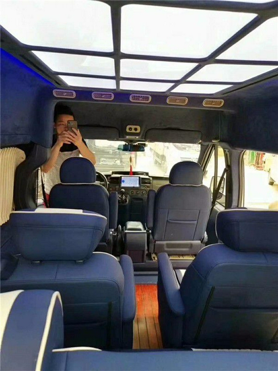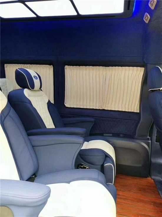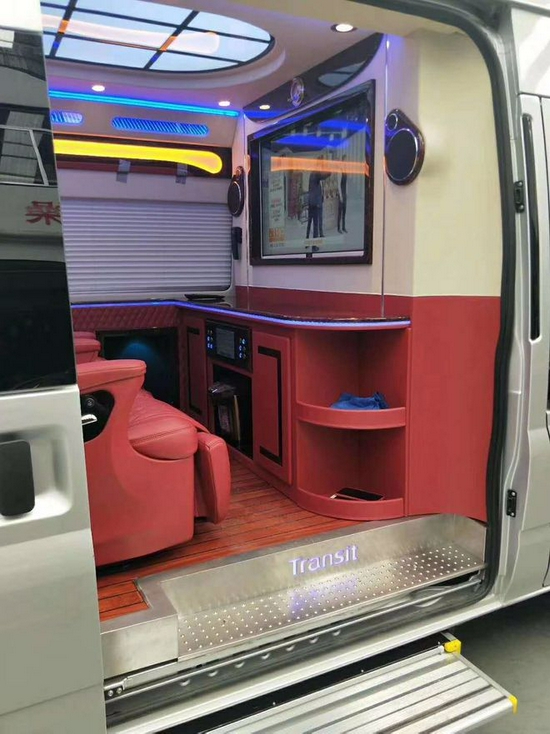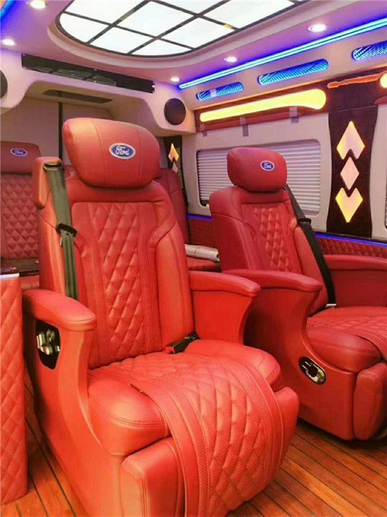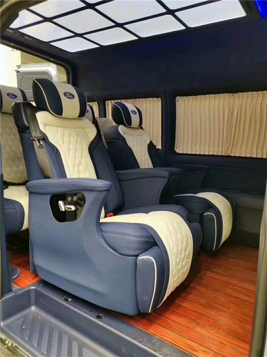 福特全顺高顶长轴车型可以照奔驰斯宾特来升级内饰,这在福特全顺中算是顶级的改装方案,全车私密性非常高,驾驶舱和乘坐舱可以分离成2个独立的空间,乘坐舱私密性极强。福特全顺改装后可以用超级豪华移动办公室来形容,首先内部装修全部真皮软包配备豪华木纹装饰,航空座椅、吊顶、高档音响、电视、沙发床一应俱全。