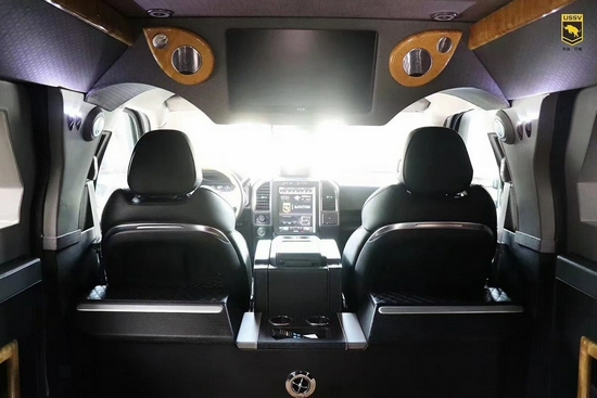 北京销售乔治巴顿驾驶舱观看整个贵宾舱的效果图。 乔治巴顿的贵宾舱双侧的车门上设计有两个隐藏抽屉,可放些遥控器小件物品。 乔治巴顿贵宾舱的车顶设计了一个带有乔治巴顿的LOGO的灯箱。 乔治巴顿驾驶舱和贵宾舱配有两部对讲电话的设计,贵宾舱对讲电话设计在右侧航空座椅的边上 乔治巴顿贵宾舱双航空座椅设计了两个隐藏式的储物格,双储物格设计有220逆变电源插座和USB接口。