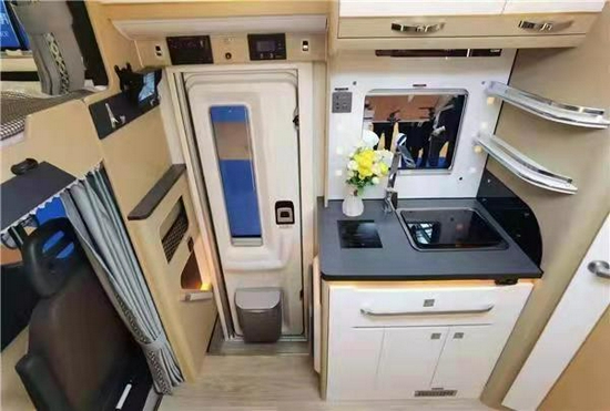 进入到生活区域,我们可以想象6米的车身加上我们的拓展舱的设计,能为整车带来的生活空间是多么的可观。内饰整体采用浅色木纹板材赫米色家具的搭配,使整车明亮、简约、大气。会客区采用对坐式卡座设计,搭配我们奔驰商务车 原车座椅,为我们提供良好的会客环境,可升降式餐桌可以在必要时为我们提供一张简易的沙发床为我们提供休息区域,厨房区域配有微波炉、进口洗菜池、156L的塞特福德冰箱、800W一体式电磁炉、抽油烟机,以及上下部分配置的储物柜,可以放置日常的厨房用品,为我们在烹饪时带来便捷。