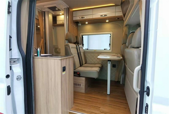 车内配有衣柜,长达3米,储物空间很足。会客区拷贝可调节双人座椅,可移动式餐桌,整个豪华皮料包覆,采用轻质环保木质家具,总共5个左右,可承载5人。厨房区域带有冷热水一体式水龙头,车载冰箱88L,带翻盖板的洗水槽。此外。小米的微波炉,800瓦的电磁炉配置齐全。整个车内有多个上方储物格,日常的存贮空间做的精细。