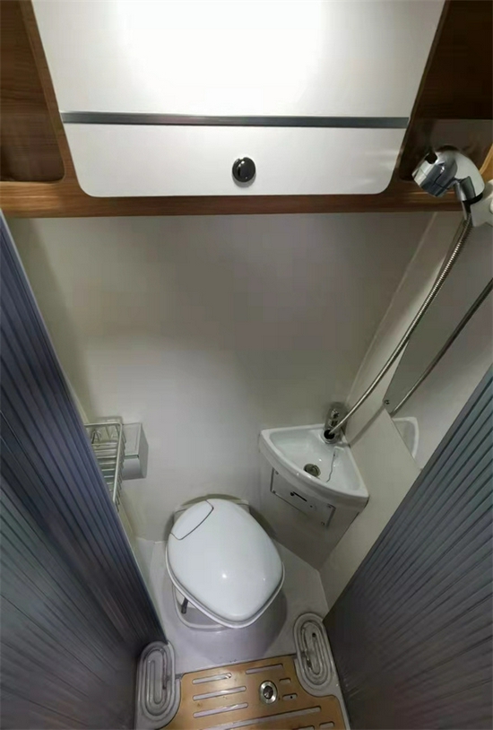 一体式的卫生间,带有全套淋浴系统。有房车专用旋转坐便,洗手盆、梳妆镜一应俱全。
