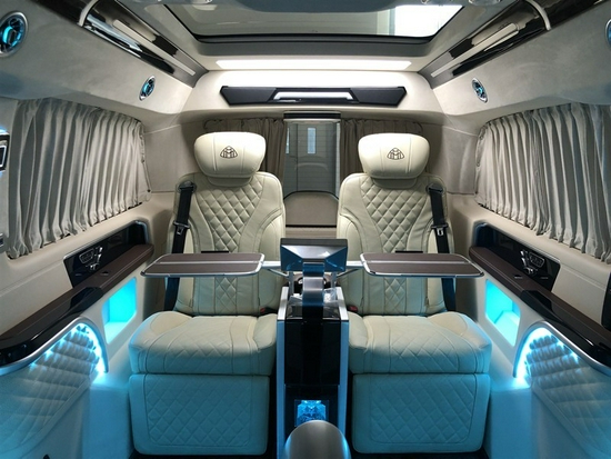 奔驰V260L迈巴赫版隐藏6座(对坐版)房车,娱乐性功能体现倒也是别具一格,32寸升降液晶电视也被首次引入奔驰V260迈巴赫版房车的设计,此外前、后置高保真音响组合立体环绕式声场,一套移动式家庭影院的私享配备。