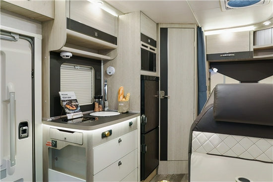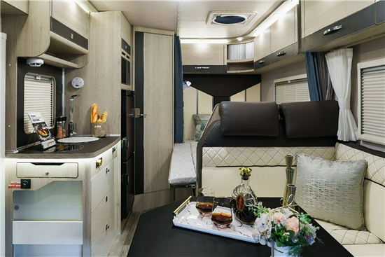 亚特Y9的生活区由额头床、会客区、厨房区、卫浴间和尾置纵床组成,通过和亚特Y8对比后我们发现,冰箱区域挪到了厢体中后部,厢体前方原冰箱位置增加了沙发座椅,最终整台车核载可以达到6人之多。亚特Y9生活区的设计风格进行了大幅度调整,包括拼色的板材颜色、亮色灯光等,和Y8上暖色偏黄的风格对比强烈,强调出了设计感。