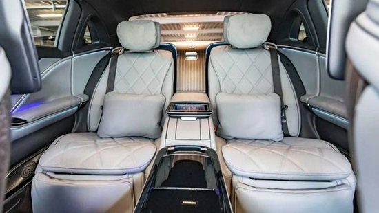 车身侧面望去,三角窗独立位于C柱之后的独特造型设计,让车身更显修长,尺寸方面,新车的长宽高分别为5470/1921/1510mm,轴距为3396mm。车尾部分,可以看到采用了双层镀铬设计的后保险杠与双边双出镀铬排气管布局,以及熏黑的尾灯,显得豪华大气。此外,新车标配了20寸迈巴赫五辐式锻造轮圈,以相似造型呼应教父级之作《Mercedes-Maybach Pullman》(梅赛德斯-迈巴赫铂尔曼)加长礼车的气派格局,如同行走的梦幻珍品。