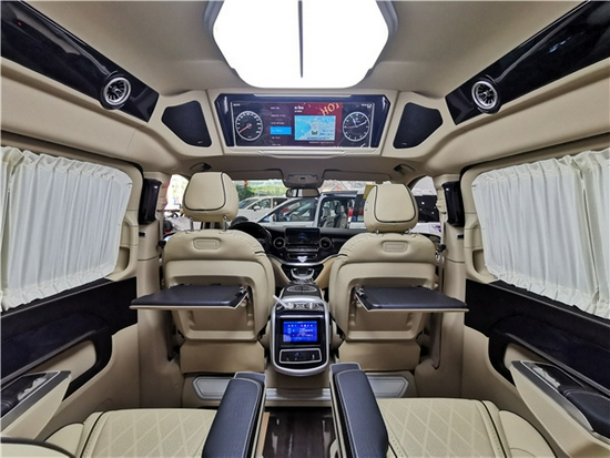 28寸的顶部车载电视,配合顶级Bose音响系统,让你的商务之行告别枯燥乏味;甄选优质木材,名家精心打造,造就豪华头等舱级座舱享受。奔驰V260L铂驰维努斯商务版采用无隔断设计,视觉效果和工艺效果非常好,BOSE音响、吧台触控屏和整车的灯光等可以一键控制开启。