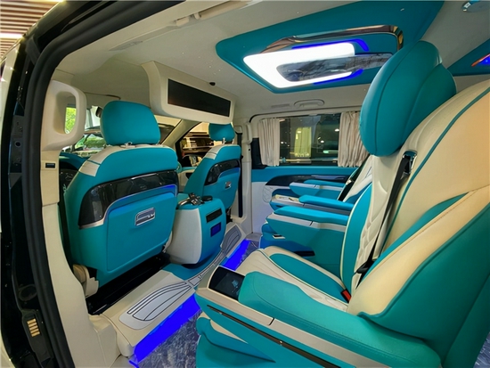 今天给大家带来的是一款由21新款奔驰威霆 (配置|询价)升级打造而成的海之韵版豪华七座商务车,也是一个颜值比较高比较年轻的版本。外观方面有着如同黑曜石般的车身,有着低调奢华的气质,前脸采用迈巴赫包围进气格栅,巴赫S级 (配置|询价)的LED灯光,边缘搭配上镀铬件装饰,其线条硬朗粗犷,显得时尚又霸气,锻造式多辐式轮毂,更加沉稳大气。