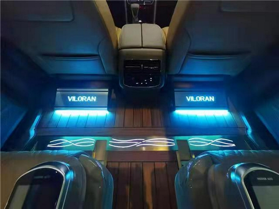 后排我们将原本比较灰暗的氛围灯光改为星空顶灯以及层次分明的氛围灯光,让我们在其中有别样的乘坐感受,搭配我们柚木地板以及脚踏让我们有良好的舒适感以及踩踏感受。