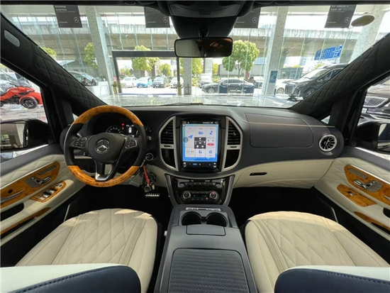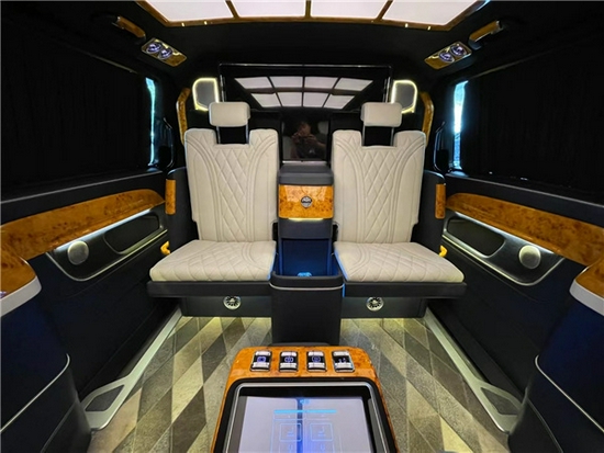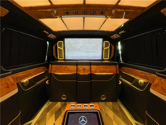 奔驰威霆改装版贵宾舱装饰极其奢华,宛如皇家宫殿,舱内采用大量缅甸黄花梨木装饰,并纯手工打造精美雕花,古色古香。奔驰威霆设计理念为高端人士商务用车之选,内饰科技感十足,座椅采用4+2隐藏六座设计,在车身长度5370mm的基础上更充分利用车内空间,在32寸电视周围用梨花木进行装饰,配合日本进口5.1立体环绕影音系统,给您带来身临其境的视觉以及听觉的盛宴。