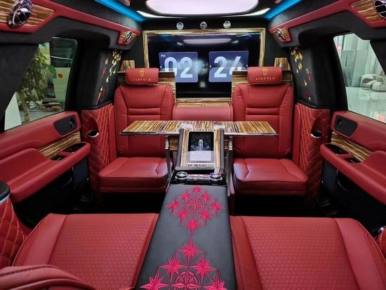2021款林肯领袖一号前后隔屏设计,电动升降的液晶电视机配上5.1声道的boss影院级音响,让您在车上也能尽情享受大片带来的震撼。而多项豪华配置的应用更将整个车厢的奢华风点缀到极致。全新一代2020款林肯领袖一号真皮桃木内饰,高级地毯,高级豪华的异域吧台,带来梦一般的境界。林肯领袖一号共有6个座位,前端是两个折叠式座椅,也称为秘书座,后排座椅是主座,它带有电加热,通风和按摩功能。