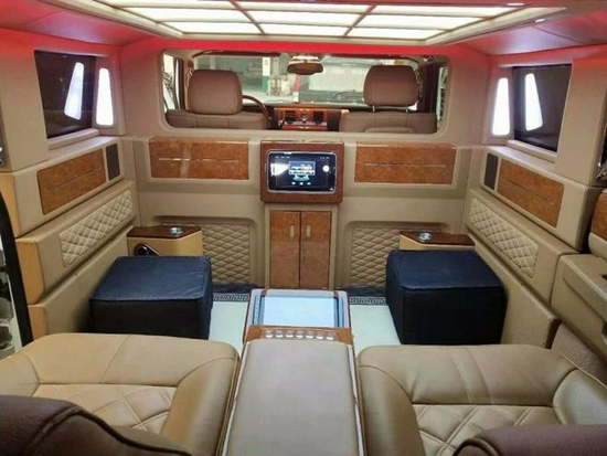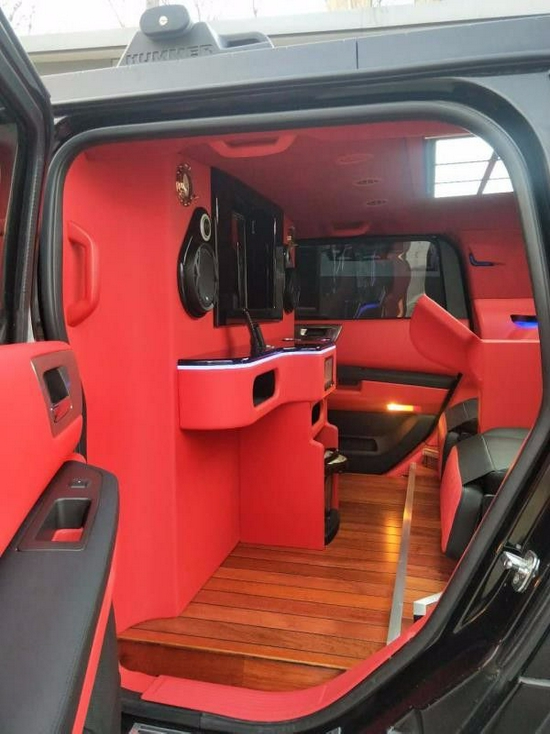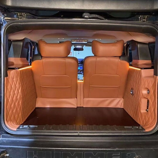 悍马车内变成了四座布局,中间放置了一个小隔断吧台,地板采用游艇级柚木地板,车顶是九宫格顶灯和星空顶,颜色变换多,这些配置的搭配和豪华商务车内饰相似,坐在越野悍马上就能享受到豪华商务车的体验。