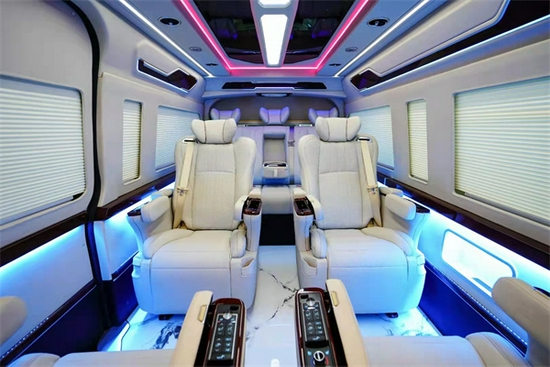 整车改装是奔着豪华舒适去的,进入车内感觉不一般。在娱乐系统方面,24寸无线吸顶娱乐电视机带卡拉OK功能,看电视,听音乐,声效级别满分,驾驶舱座椅靠背桌板,能当电脑桌使用,各种线条氛围灯带随处可见。整车除了具有商务功能化,也具有了娱乐功能。