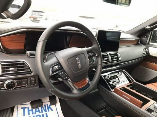内饰非常奢华,多功能方向盘,中控台的造型与宽大的车身相呼应,新车全部真皮包裹座椅,内饰采用桃木搭配设计,高贵典雅,加高加大的车身除了增加内部空间外,还给人营造一种尊贵典雅的感觉。最新林肯领航员新车采用了2+2+3的座椅布局,第二排采用了两个独立座椅,座椅内侧均配有扶手,舒适度超强。
