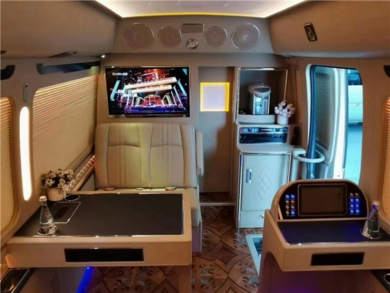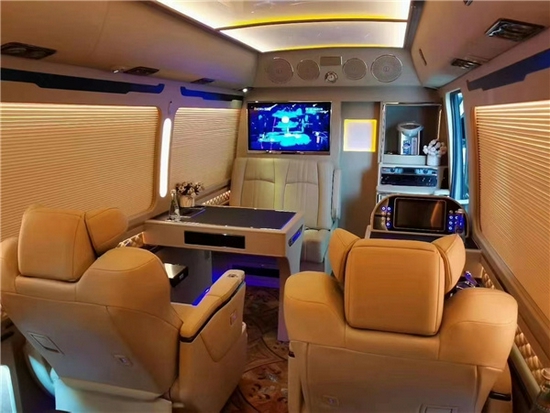 内饰增加豪华高档办公桌以桃木及真皮为材料,打造舒适高端使用的办公环境。360度可选装首长席,双人汇报席,方便旅途中的您进行紧急会议,舒适的座椅,实用的办公设置,贴心的电源以及显示屏设置,考斯特高级改装于细节之处展现尊贵风格,在凡之体现贴心设计。