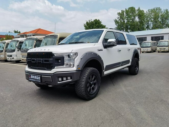 福特F150猛禽改装六座SUV外观方面,颇具动感,内饰豪华,配置丰富,同时兼具跑车的动力性能、越野车的全地形制霸能力和豪华轿车的乘坐舒适性,巨大的长方体蜂窝式格栅中间镶嵌着福特的大标,再加上全新设计的保险杠和发动机舱盖,使车头拥有了震撼的冲击感。