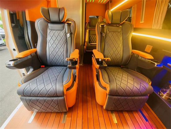 地板部分采用的是商务车同款的游艇级柚木地板,彰显整车档次,也更好打理,耐造。中排的两个航空座椅和商务车一样带有通风,加热,按摩,腿托的所有功能,多方位进行调节,触摸屏进行控制。车辆侧壁上还带有小柜子,可放酒,放茶,档次格调都是很高的。