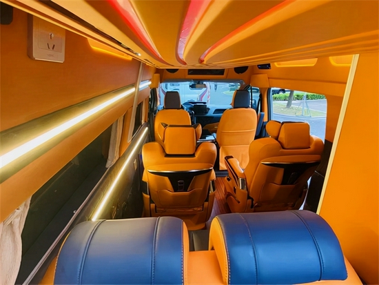 后排采用的联排座椅可以乘坐两人,在需要休息的时候还能拼成床铺。顶部配备有一个可升降的吊床,适合单人休息。整车内饰的用料,灯光设计和布局完全按照商务车来做的,橙黄色内饰,显示出车内的高贵和大气,也显得比较温馨,柔和的灯光明亮又不刺眼,多色的氛围灯烘托整车的布局与色调。