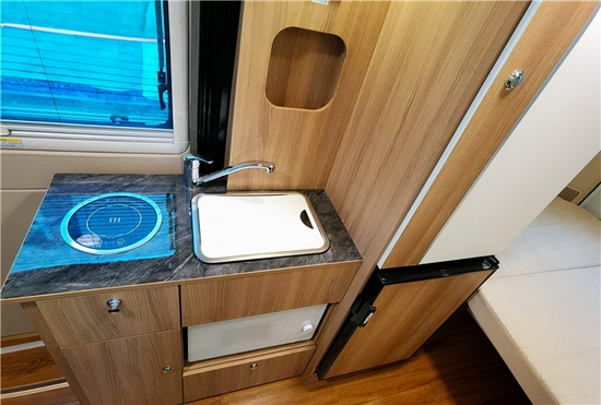厨房区位于车身右侧区域,采取了一体式橱柜的设计,内部搭载盖板式洗菜池、电磁炉、内嵌式微波炉等设施,充分满足日常在车内烹饪的需求;同时操作台下方还设计了多个储物柜与抽屉便于物品分类存放;操作台上方设有隐藏式储物格可用于放置厨房用品;顶部为中央集成按键控制系统;右边还配置了车载88L冰箱与衣柜方便日常使用;