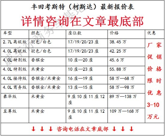丰田考斯特/一汽丰田柯斯达 (配置|询价)销售改装内饰价格订制私人订制商务房车:6座7座8座9座企业豪华接待专用:10座11座12座13座14座15座政府通勤采购商务:16座17座18座19座20座23座。统一出场合格证大量现车,全国最大最专业的丰田考斯特销售改装大厂,全系低价售全国!