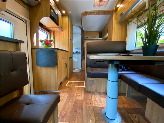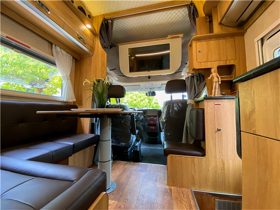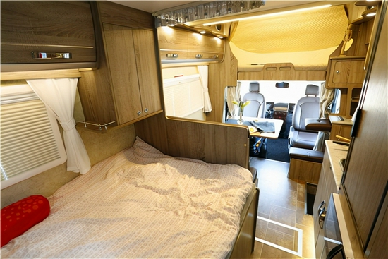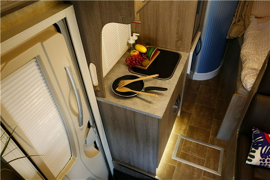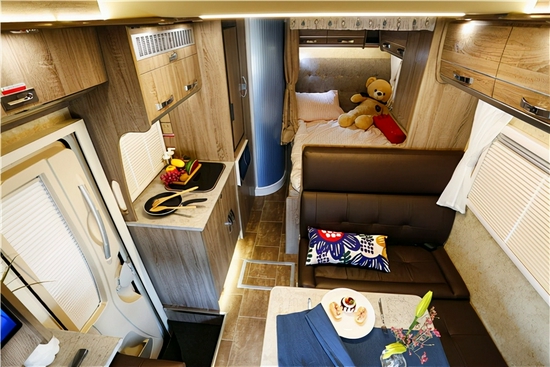 整车车内风格清新自然,多采用生态板材家具,简约自然、清新舒雅。搭配房车专用地板革、组合式吊柜,居家空间在暖黄色的氛围灯的衬托下,显得尤为浪漫温馨。合理的空间安排让这款车不仅仅外部颜值高,内部也是如家一般美好,即使没有拓展,车内的空间也很大,生活区设施齐全,分别由额头休息区、会客区、厨房、卫生间、纵置床组成。