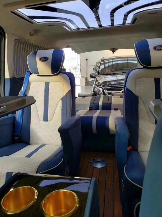 福特途睿欧第三排沙发床在后尾门关闭的状态下也可以放下,而且中排空间依然很大,在行驶途中可以美美的睡觉,这点是埃尔法也无法对比的,它的内部空间比奔驰威霆还大,秒杀别克GL8和埃尔法,舒适度在对比奔驰威霆和别克GL8的情况下更加舒适,因为空气悬挂就是一大亮点。主副驾驶后背的隐藏式靠背桌板是由其他车型专用的靠背桌板改装而来,因为桌板为模具化生产所以效果不是十分完美,但是实用性倒是很高,中央扶手为特质款式,因为主驾驶右侧有手刹,所以中央扶手冰箱进行了一侧凹型处理,踏板LOGO单独雕刻成型,踏板是手工量身制作,不同于别克GL8和奔驰威霆有模具化的踏板,制作难度上有所提高。后排座椅可以前后移动和放倒当床来使用,特制的衣服架可以在车内挂很多衣服,这样可以满足日常出行的需求。