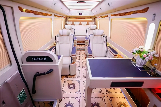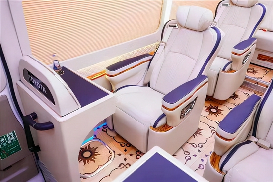 内饰部分地板采用实木拼花散间的地板具有阻燃、抗静电、防滑、环保,易打理等特点,豪华桃木办公桌搭配真皮包覆,桌面设有杯托、2220V电源插口、对讲机、安全扶手等。抽屉的设计可以用以存储重要文件。可折叠的办公小桌板使用桃木纹装饰,及舒适又美观,最大程度上满足乘客的商务需求。