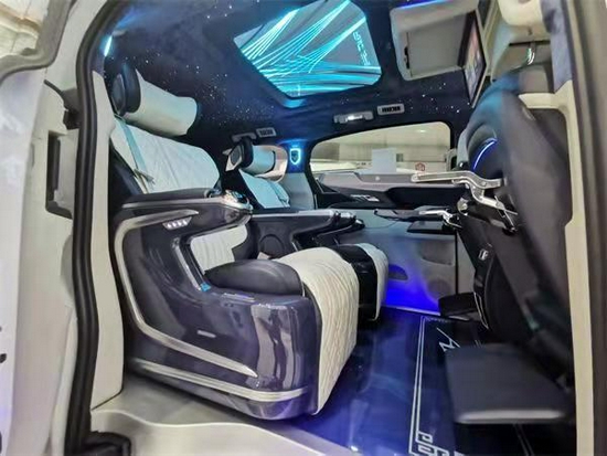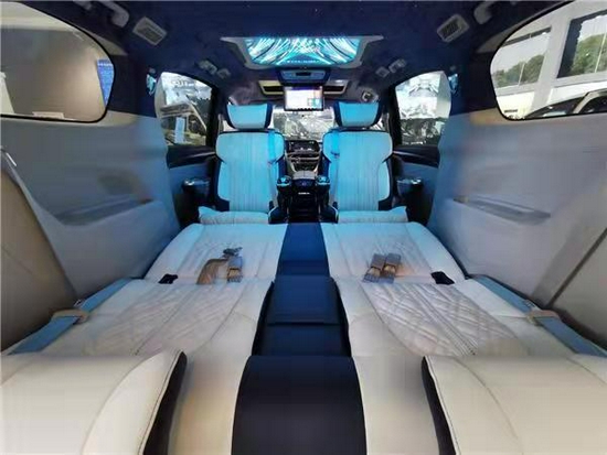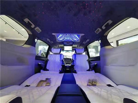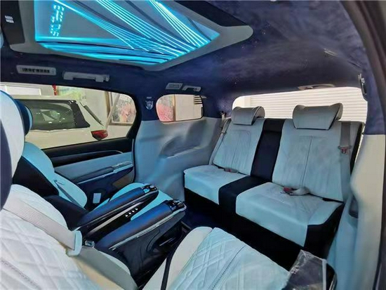 整车采用大面积的皮质包覆,以及顶部我们也是进行了进口麂皮绒包覆。座椅采用水晶宝座款的航空座椅,具备通风、加热、按摩、靠背调节、腿托调节等功能为我们提供舒适的乘坐感受,以及高光艾维尼亚地板,配上我们的氛围灯光以及满天星的星空顶灯,让我们整车的豪华性与氛围感得到了很好的提升。